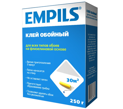 В ассортименте продукции компании «Эмпилс» появился клей для обоев. Клей EMPILS предназначен для всех типов обоев на флизелиновой основе и выпускается в пачках по 250 г. Он легко наносится на стену, не оставляет пятен, позволяет просто подгонять стыки обойных рулонов, препятствует образованию грибка и допускает впоследствии удаление обоев без увлажнения.
